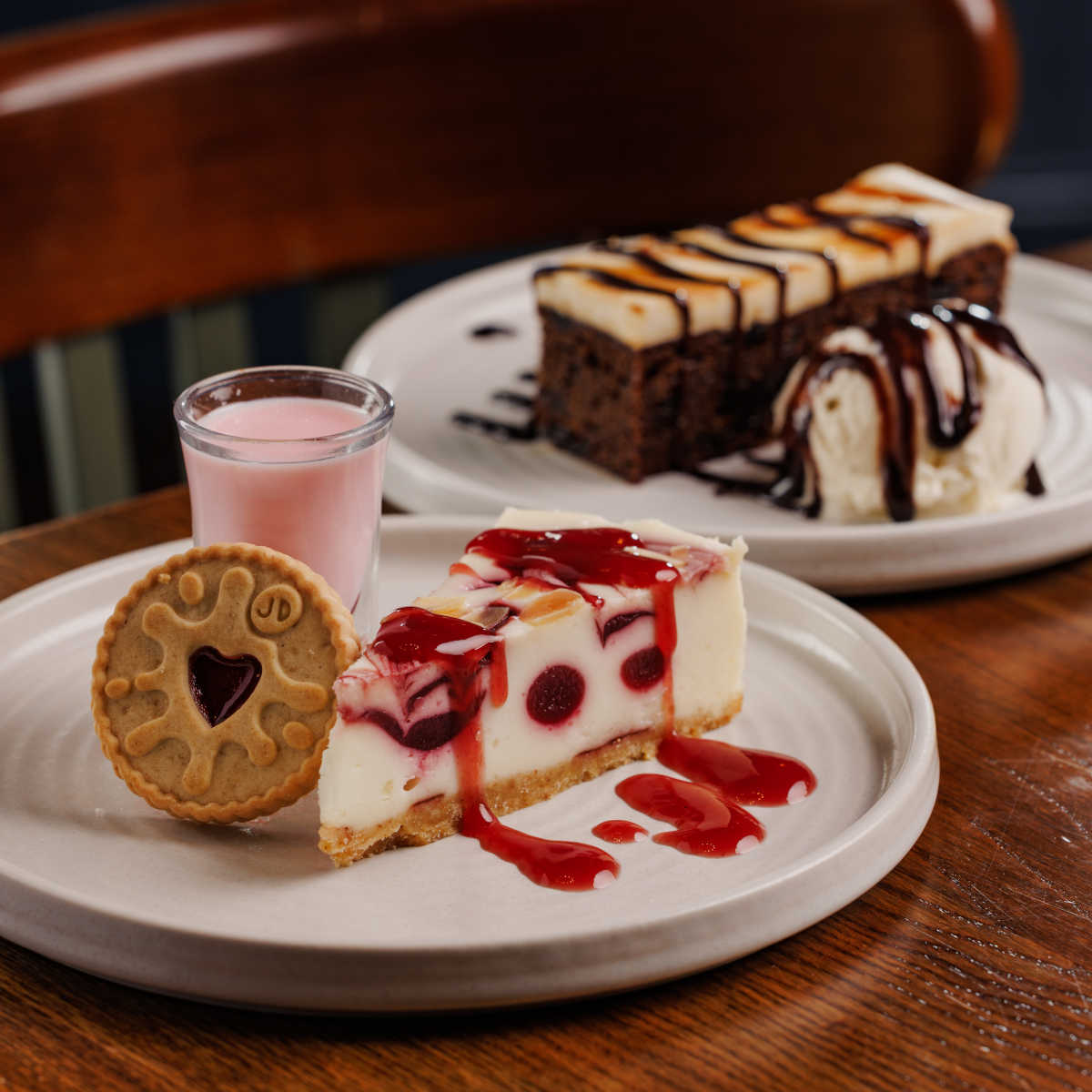 Jammie dodger cheesecake, raspberry & cherry cheesecake topped with almonds, with a boozy raspberry shot on the side (contains alcohol) (v) | 7.49 601 kcals