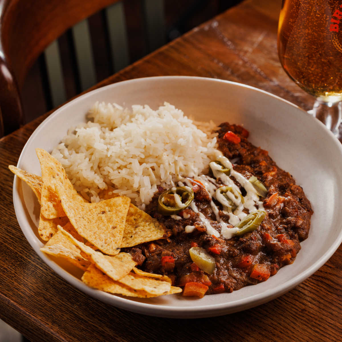 Chilli con carne, with long-grain rice, tortilla chips and jalapeños | 9.99 441 kcals