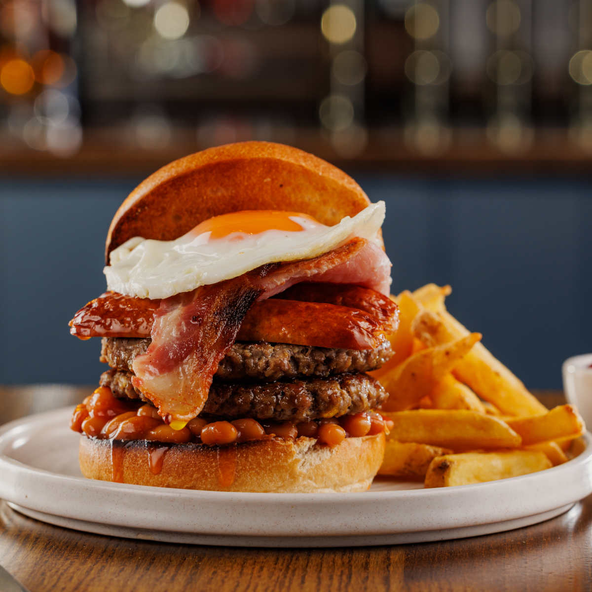 Traditional breakfast, pork sausages and bacon rashers served with a free-range fried egg, hash brown, mushrooms, tomato and baked beans | 10.99 1184 kcals