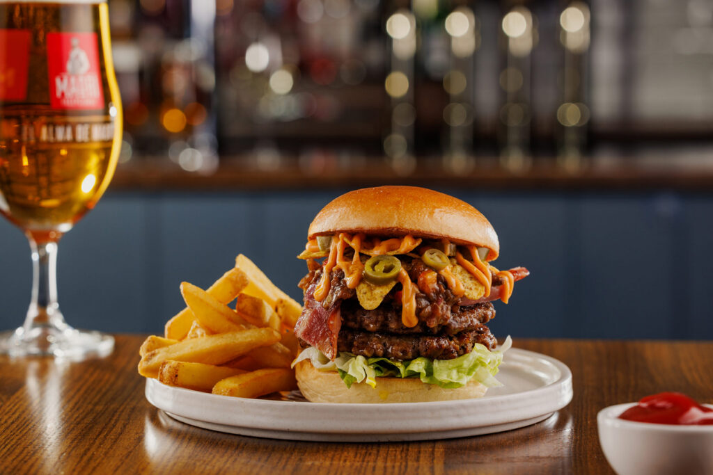 Chilli nacho, two 3oz beef patties topped with chilli con carne, cheesy nacho sauce, bacon, jalapeños and tortilla chips | 13.99 1337 kcals