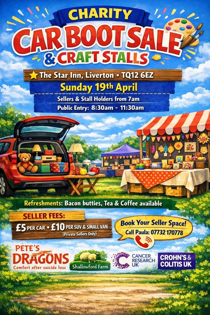 Sunday April 19th The Star is hosting a Charity Car Boot Sale. It opens to the public at 8:30am with sellers welcome from 7am. They'll be car boot, craft and cake stalls, and of course the pub will be making bacon butties, coffee and tea so you don't starve or die of thirst whilst stalling or shopping....Book your slot with Paula on the number below.